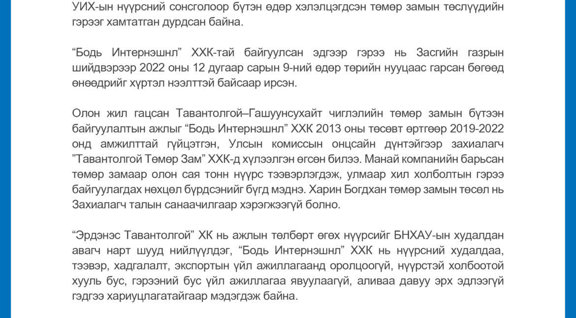 ТАВАНТОЛГОЙ–ГАШУУНСУХАЙТ ТӨМӨР ЗАМЫН ЦОГЦОЛБОР ТӨСЛИЙГ ХЭРЭГЖҮҮЛСЭН ГЭРЭЭНҮҮД