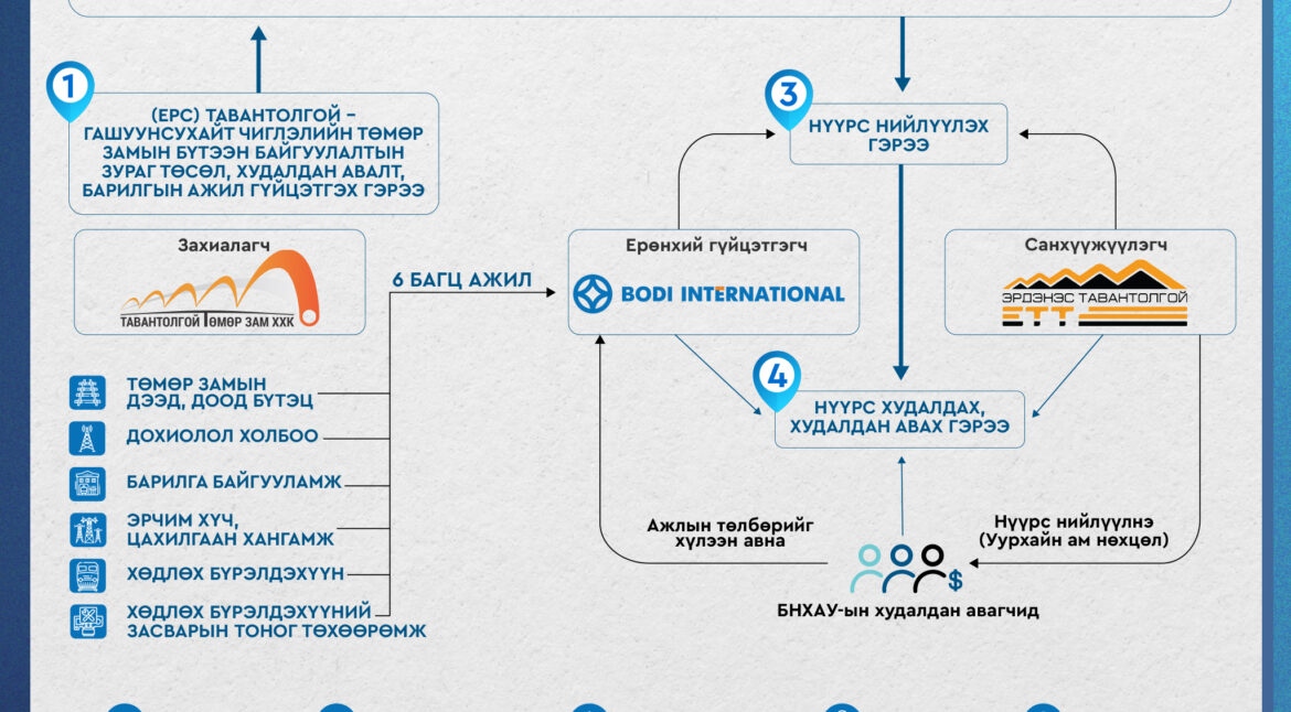 ТАВАНТОЛГОЙ–ГАШУУНСУХАЙТ ТӨМӨР ЗАМЫН ЦОГЦОЛБОР ТӨСЛИЙН ГЭРЭЭНИЙ БҮРДЭЛ   “Эрдэнэс Тавантолгой” ХК, “Тавантолгой төмөр зам” ХХК, “Бодь Интернэшнл” ХХК-ийн хооронд байгуулсан Тавантолгой–Гашуунсухайт чиглэлийн төмөр замын бүтээн байгуулалтын зураг төсөл, худалдан авалт, барилгын ажил гүйцэтгэх болон санхүүжилтын гэрээний хүрээнд Монгол Улсын стратегийн өндөр ач холбогдолтой, дэд бүтцийн томоохон цогцолбор төслийг амжилттай хэрэгжүүлж…